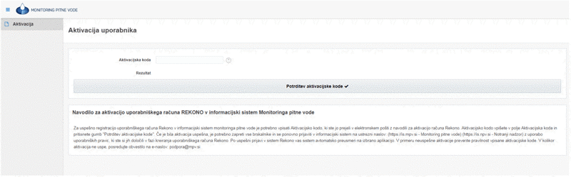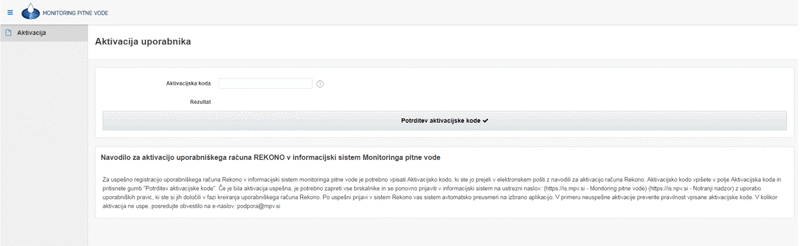 Za uporabo prijavnih mehanizmov Rekono v informacijskem sistemu monitoringa pitne vode je ob prvi prijavi potrebno izvesti aktivacijo uporabnika.